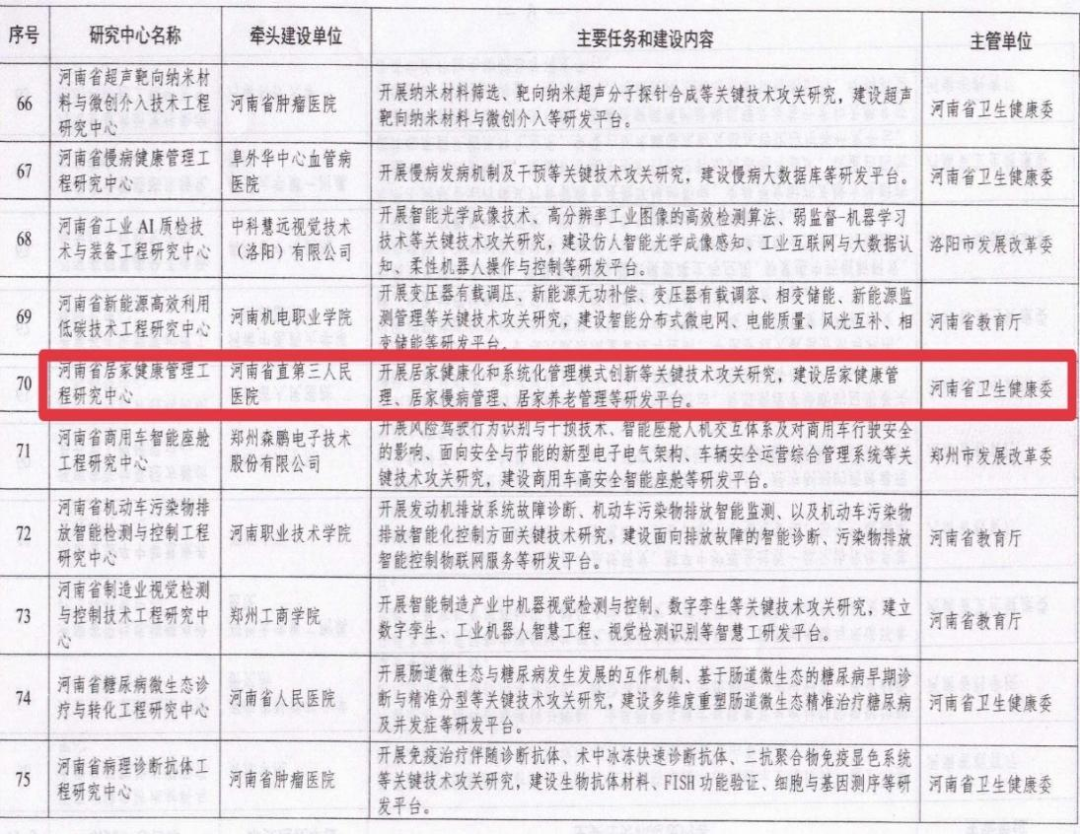 近日,河南省发展和改革委员会2022年河南省工程研究中心批复名单出炉,河南省直第三人民医院申报的河南省居家健康管理工程研究中心成功获批。