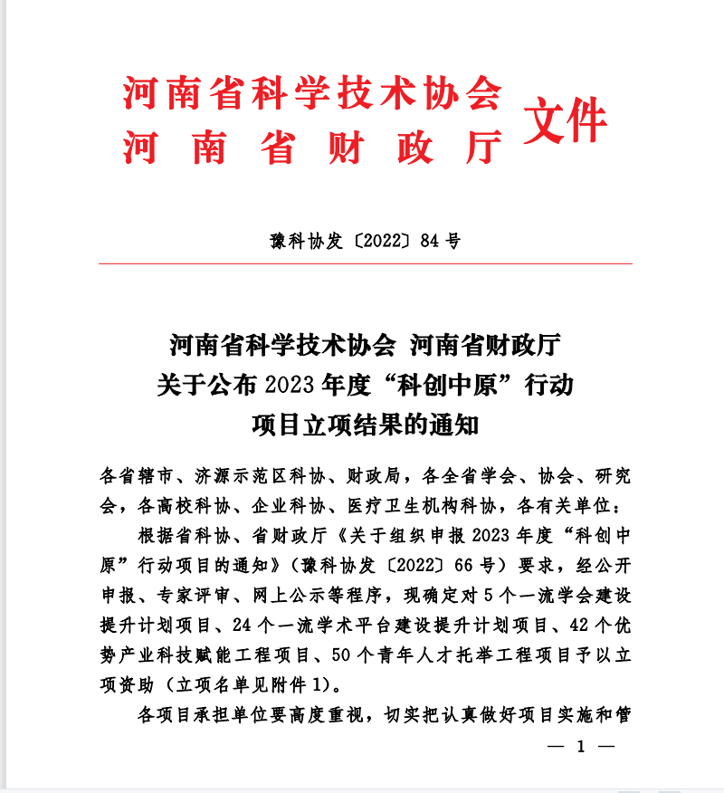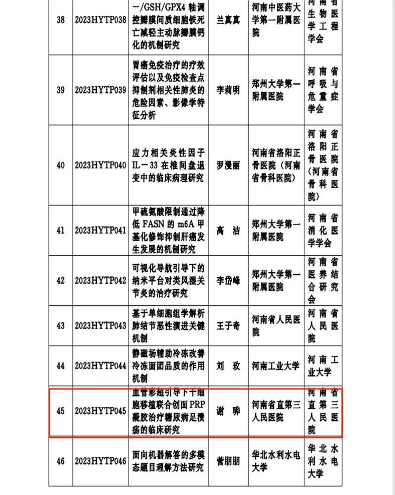 2022年12月29日河南省科学技术协会发布了《关于公布2023年度“科创中原”行动项目立项结果的通知》,全省共有50个项目入选2023年度河南省青年人才托举工程项目。我院整形外科/创面修复科王军杰主持的《血管彩超引导下干细胞移植联合创面PRP凝胶治疗糖尿病足溃疡的临床研究》成功入选,其中宋瑞捧、任丽君、娄艳红、彭喜涛为托举成员,谢骅为被托举对象。